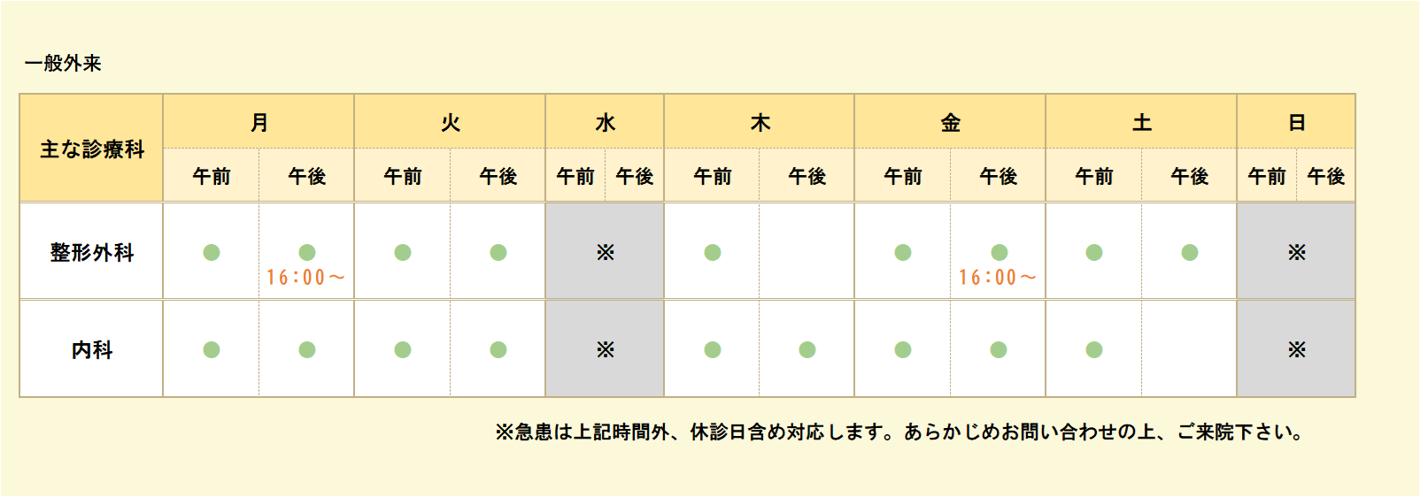 ※急患は上記時間外、休診日含め対応します。あらかじめお問い合わせの上、ご来院下さい。