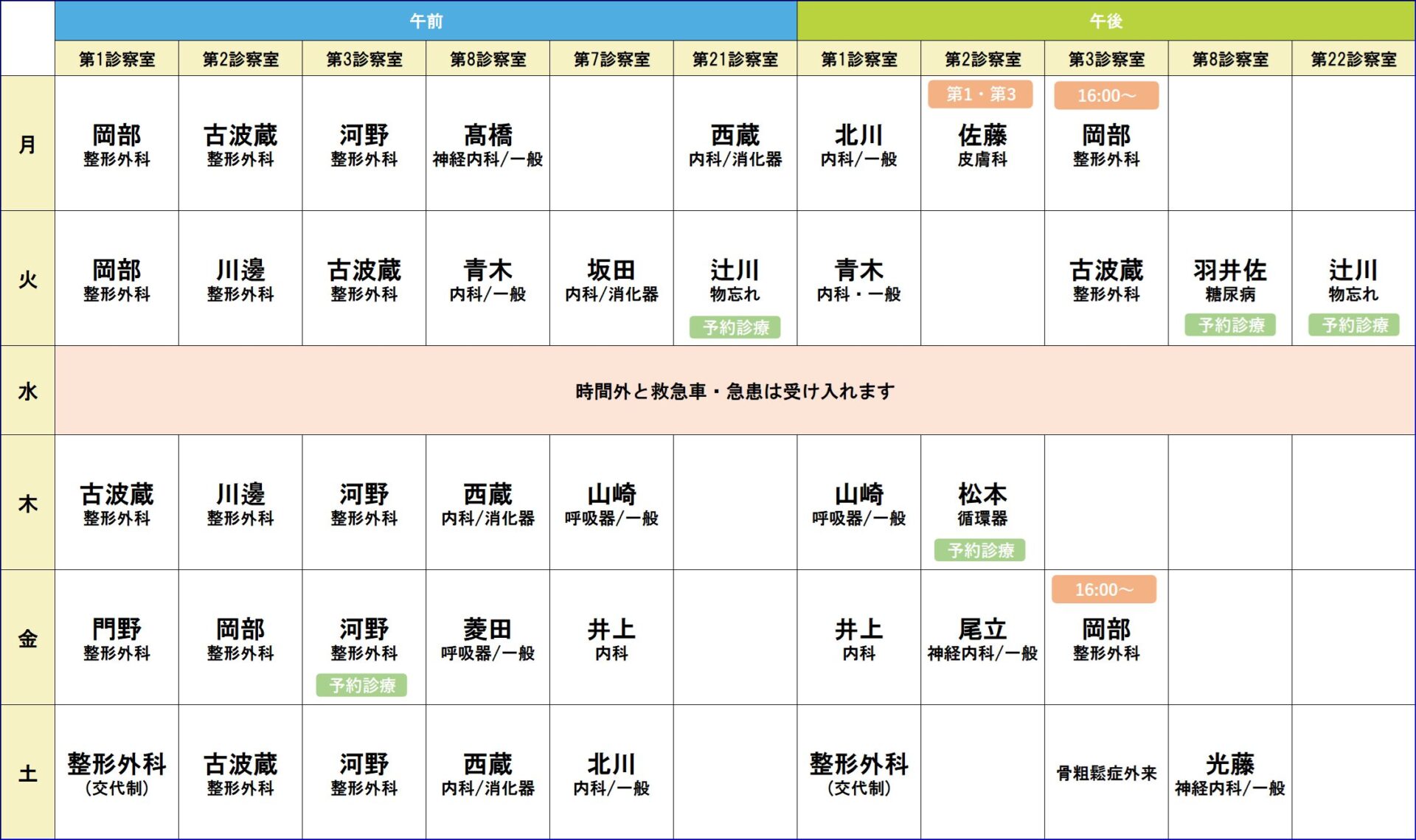 診療科により診療時間や週毎に担当医師が異なっている場合があります。緊急手術・検査等で外来診療が中断もしくは休診になることがあります。