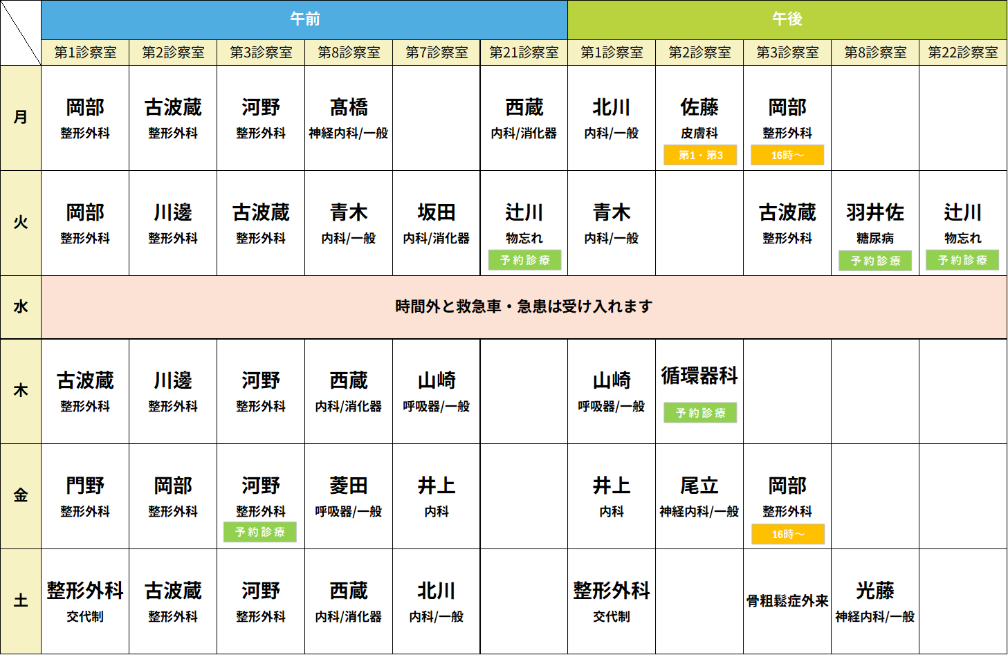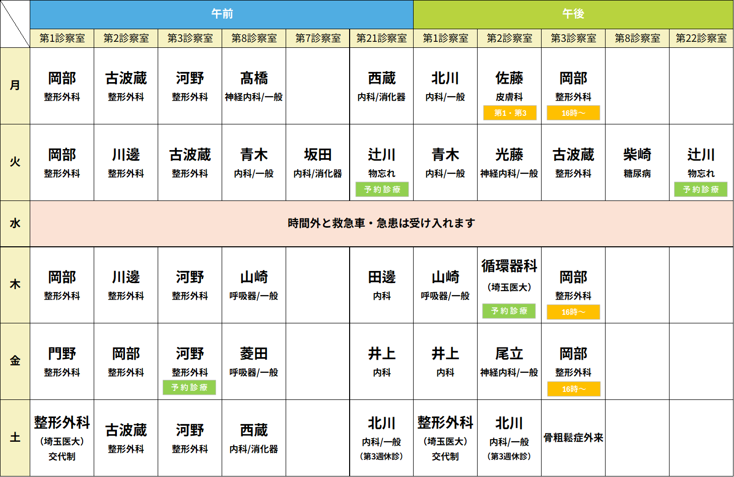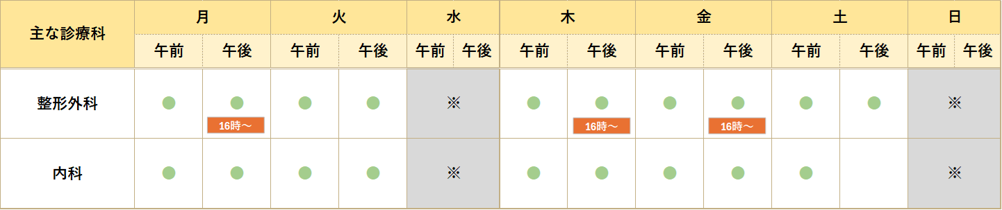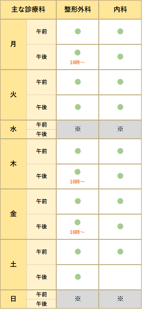 診療科により診療時間や週毎に担当医師が異なっている場合があります。緊急手術・検査等で外来診療が中断もしくは休診になることがあります。